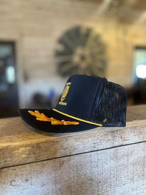 Introducing the Designer's Brew Throwback Hat. A timeless throwback look with a classic black trucker cap and gold oak left embroidery. Expertly crafted to fit most head sizes, this hat is a must-have for any fashion-forward individual. Show off your style with this iconic piece.