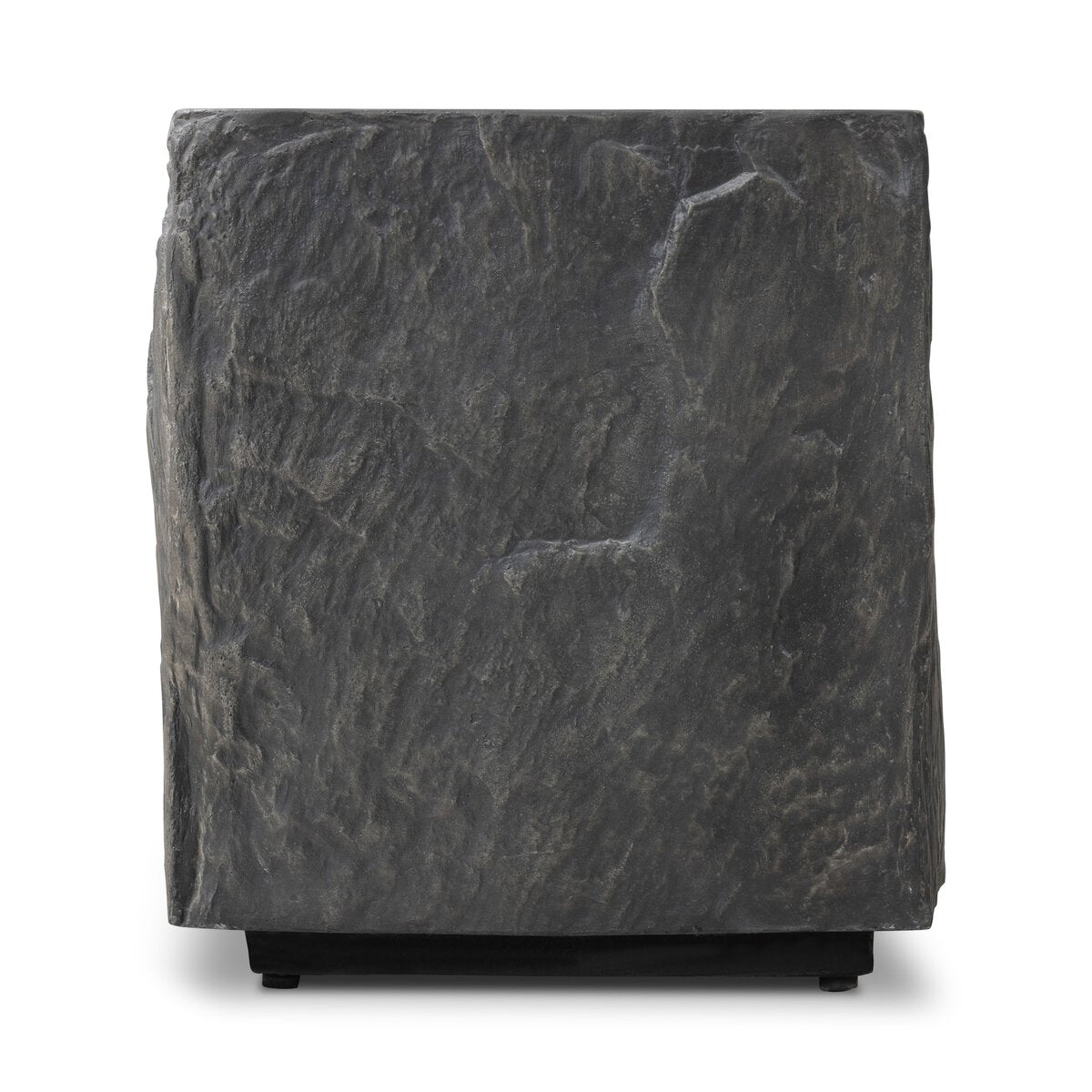 Cast black concrete features heavily textured sides that resemble natural slate, paired with a smoothed tabletop.