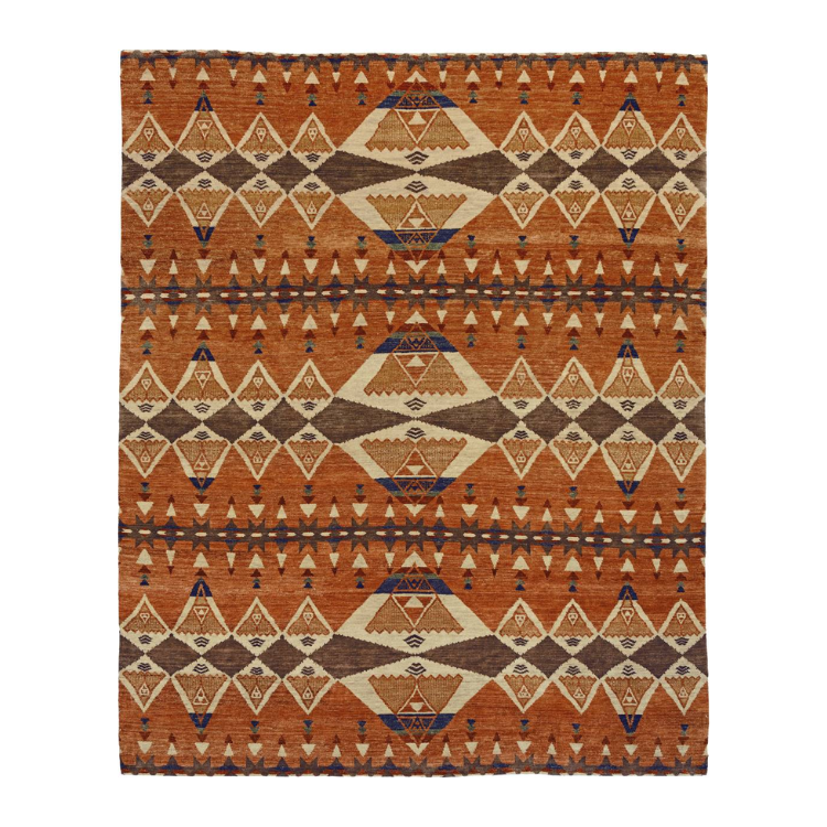 SThis flat weave rug features warm shades of brown, tan, and burnt orange, complemented with accents of red and navy.