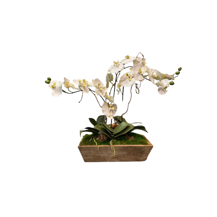 Simple yet impressive, this arrangement features three real-touch phalaenopsis orchids intertwined with kiwi vine, blooming leaves and preserved mood moss. Enjoy the contrast of the beautiful white orchids and the rustic barnwood planter. Forever Green Art hand-makes every container.